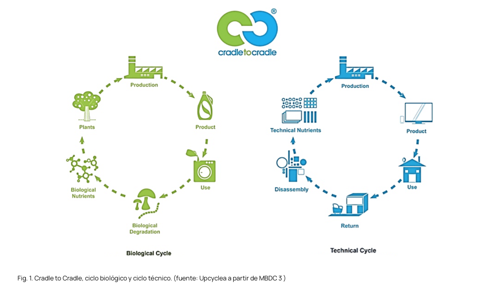 Por otro lado, existe otra corriente, el llamado Cradle to Cradle cuya máxima es waste = food. Se plantea la idea de que los productos y servicios deben ser diseñados para una economía circular en vez de lineal, pensando en todas la fases de su ciclo de vida. Considera los desechos como un recurso principal que puede ser reintegrado de manera segura en ciclos continuos, de manera muy similar a la biomimética. Este enfoque se centra en dos ciclos principales: el ciclo biológico y el ciclo técnico. En el ciclo biológico, los materiales orgánicos vuelven a la tierra de manera segura, actuando como nutrientes para los ecosistemas. En contraste, el ciclo técnico se refiere a los materiales no biodegradables que pueden ser reciclados de manera continua sin perder calidad ni generar residuos tóxicos.